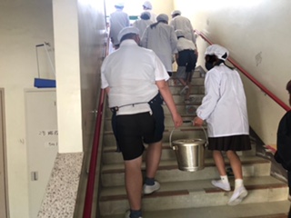 (上と中の写真 2年生、6年生)給食室で受け取った食缶や牛乳、食器などを教室まで運びます。