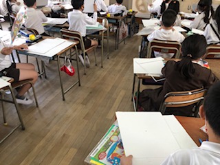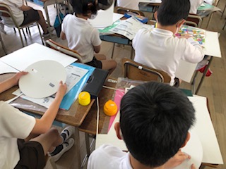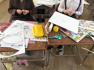 3年生の工作教材です。くるくる回る台紙に紙を貼ったら、絵を描いたりしながら作っていきます。
