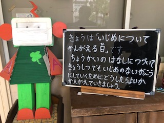 今日は、いじめについて考える日です。朝会で話した後、教室でも、いじめを防ぐためにどうしていけばいいのかなどを考えていきます。