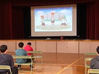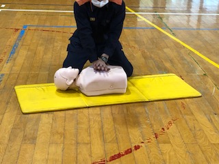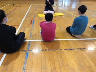 DVDを見た後、消防署の方から心肺蘇生法のやり方を教えていただきました。この後、教職員が行いました。
