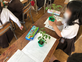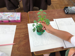 ミニトマトを植えていきます。その前にしっかりと観察しました。葉や茎に毛が生えているなどの意見が出ていました。