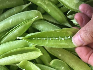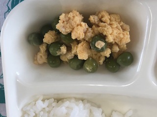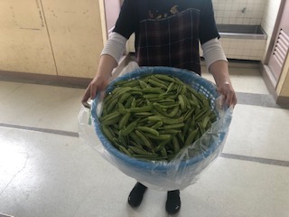栄養職員が今日の給食で使われたえんどう豆のさやを持って教室をまわっていきます。