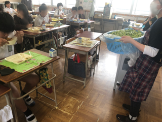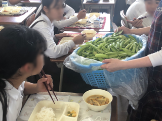 栄養職員が豆をとった後のさやを子どもたちに見せています。給食調理員がこのさやから豆を一さやずつ取っていったことなどのお話しをされました。6年生の子どもたちが興味を持って見ていました。