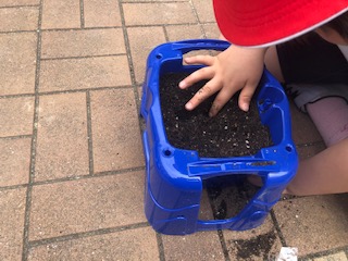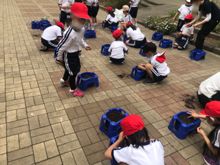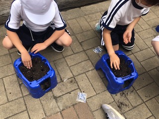 今日は1年生があさがおの種をまきました。自分の植木鉢に土を入れて、指で穴を開けて一粒ずつ種を入れていきました。