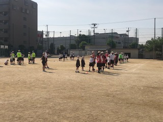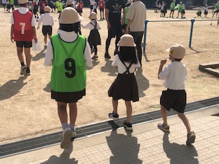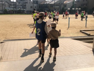 6年生が1年生を連れて運動場に集まってきました。他の学年の子どもたちもたてわり班の場所にいきます。