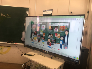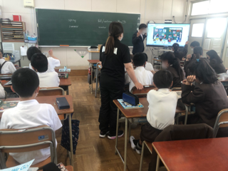 6年生の外国語の授業の様子です。この時間はネイティブスピーカーの講師の方が入られて、担任と共に授業を進めています。