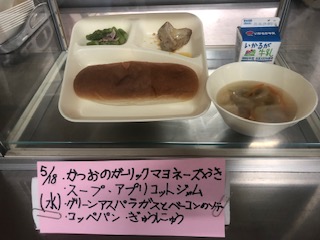 今日の給食には、かつおが食材として使われていました。5月にふさわしい献立ですね。