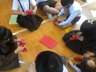 今日の委員会活動は、運動会に向けての作業や練習です。写真は、ゴールテープの使い方、プログラムごとの役割分担、門の飾りつけ作りです。