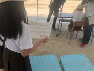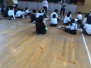 写真は、説明を聞いている場面、用具の準備、放送の練習です。