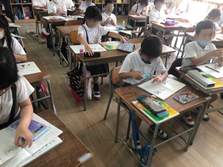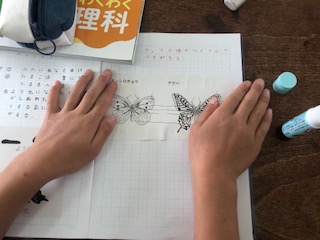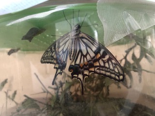 幼虫から育ててきたアゲハチョウがさなぎを経て、成虫(チョウ)になりました。今日の学習では、成虫の体のつくりを調べました。