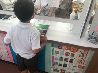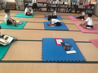 1年生が図書の時間に本を読んでいます。お気に入りの本を借りています。