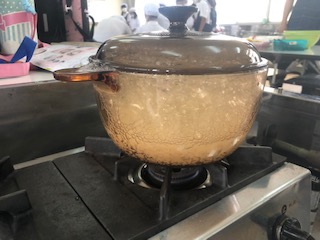 耐熱ガラスの入れ物でご飯を炊いて、どのように炊けていくのかを見ています。