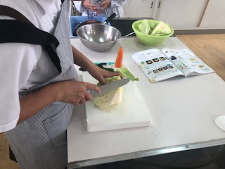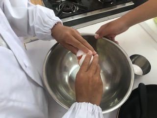 野菜を切る時に手を切らないように慎重に包丁を扱っています。たまごを割るのもていねいにしていました。