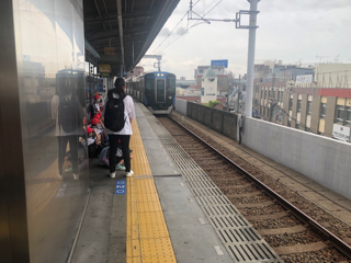 阪神電車に乗って尼崎センタープール前駅まで行きます。車内はすいています。