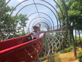 長い長いすべり台からは次々と子どもたちがすべってきます。手を振って笑顔で喜びを表しています。