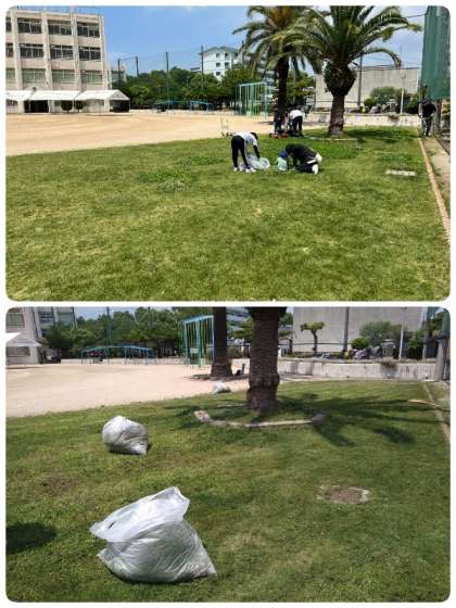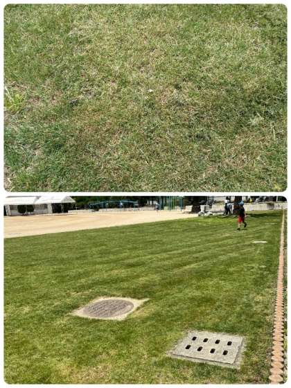 本日、芝生実行委員会のみなさん、PTAのみなさんで令和4年度第1回目の芝刈りを実施していただきました。