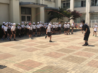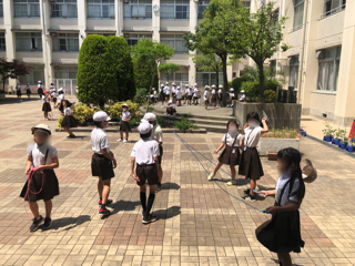今日は、学年ごとに運動会のリハーサルをしています。時間を設定して順に行っていますので運動場では遊べません。その代わり、中庭で子どもたちが遊んでいます。クラスで大縄跳びをしている様子も見られました。