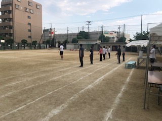ラジオ体操について、教職員も指導できるように研修をしてきました。今日は最後の練習をしています。
