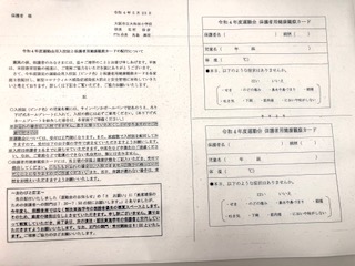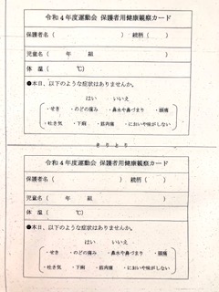運動会当日は、運動会用の入校証と保護者用健康観察カードが必要です。