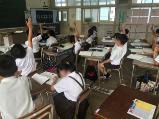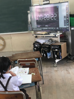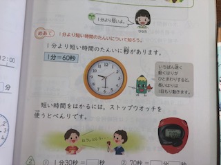 1分より短い時間を学習しています。児童の1分間の間隔を確認するため、目を閉じて1分間たったと思ったところで手をあげるように指示しています。