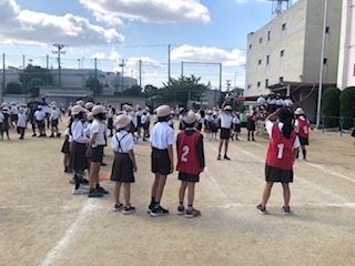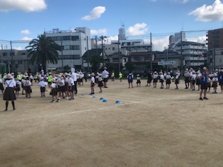 二つのたてわり班が一つの長なわを使ってとんでいきます。