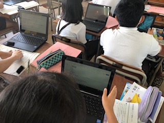 5年生が一人一台端末を使って環境問題について調べています。