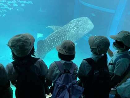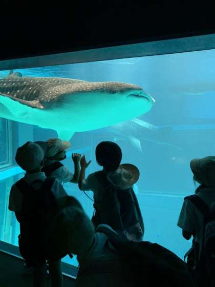 子どもたちの目の前を大きなジンベイザメがゆっくりと泳いでいます。