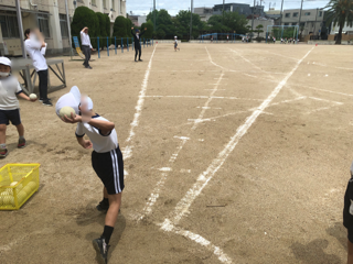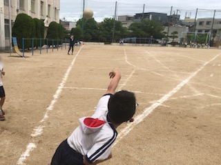 2年生がソフトボール投げをしています。