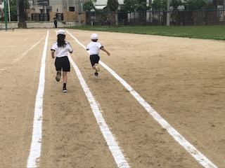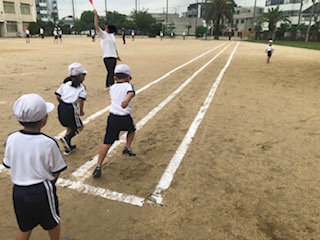 1年生が50mを一生懸命に走っています。タイムもとっています。
