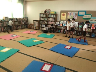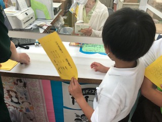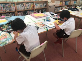 学校図書館で本を読んでいます。学校司書の方が本の貸し出しをされています。