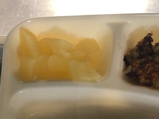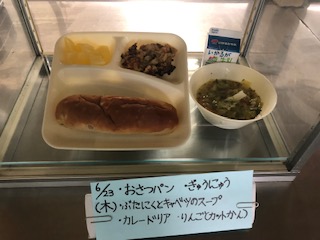 今日の給食のパンには、さつまいもが入っていました。デザートはりんごの缶詰でした。