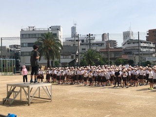 児童朝会では、校長から先週のあいさつ週間での代表委員の活躍を話しました。さらに教育センターから授業を見に来られた方にあいさつした児童、社会見学で駅員さんにあいさつをしていた4年生のことを話しました。