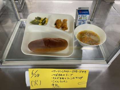 今日の給食の献立は、鶏肉のカレーマヨネーズ焼き、てぼまめのスープ、さんどまめとコーンのサラダ、黒糖パン、牛乳でした。
