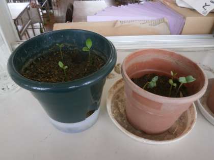 先日、飼育栽培係りが育ててくれた豆苗を希望者で食べたのですが、その後も係りのみんなは食べられるものを栽培することに熱心です。今、教室の靴箱の上には2種類の食べられるものが芽を出しています。一つ目(写真1枚目)は家から持ってきてくれたキンカン。2つ目(写真2枚目)は給食に出てきたメロンです。3枚目の写真は両方の植木鉢を並べて写しています。係りのみんなは卒業するまでにはどちらも食べられるものと思っていた様子で、「キンカンは木になるから何年もかかるよ」と言うと、「え〜?卒業してしまうやん〜」とがっかりした様子。「おいおい!」と突っ込みたくなったのは担任だけでしょうか(笑)