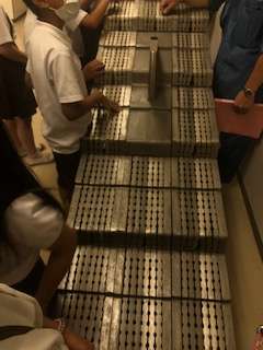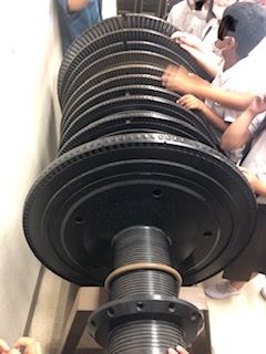 工場で使われている(いた)物が展示されていて、さわって確かめています。