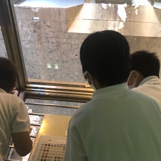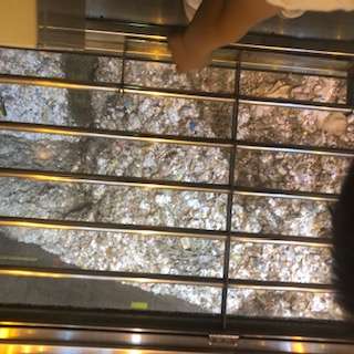 ガラス越しにピットにたまっているたくさんのごみを見ています。