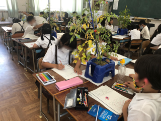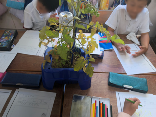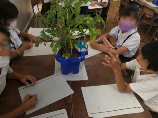2年生が育ててきたミニトマトに実もつき始めました。今日は観察して絵をかいていました。