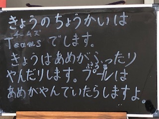 雨は降ったりやんだりですね。雨がやんだいる時はプールに入ります。プールの用意は登校時に雨が降っていても持ってくるようにお願いいたします。