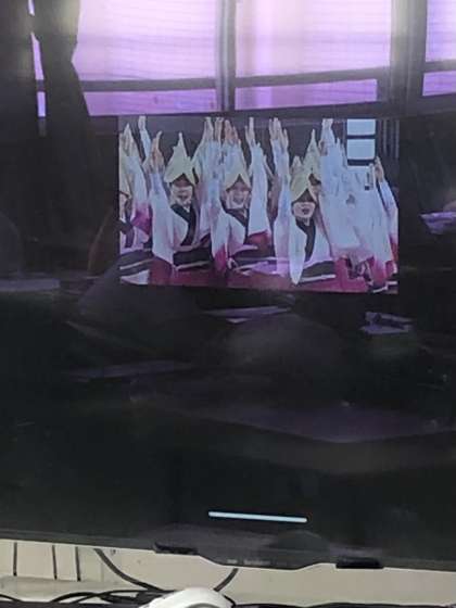 写真だけではお伝えできないのが残念ですが、子どもたちが日本の民謡の曲を聞いているところです。画面に出ているのは阿波踊りですね。