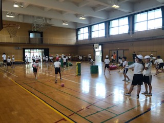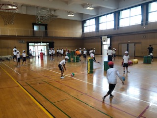 今日は雨とため、ふだん屋外で行なっているスポーツクラブと、室内運動がいっしょに活動しました。マットを立てて工夫されたルールで楽しくドッジボールをしています。