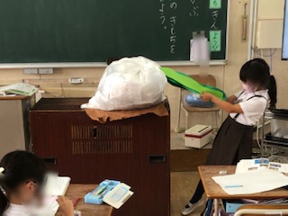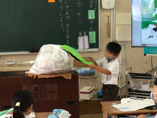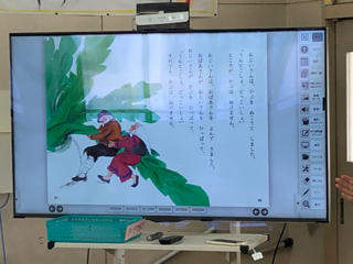 国語の物語「大きなかぶ」を学習しています。かぶをひっぱるところを演じながら表現しています。