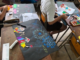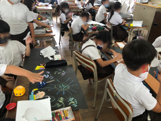まず、花火を描きました。別の紙にその花火を下から見上げている姿を描いて、貼り付けました。