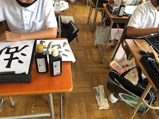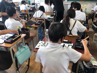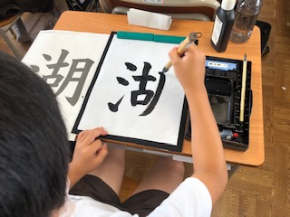 食に関する指導をしている同じ時間に、別のクラスでは毛筆で「湖」の字を書いていました。