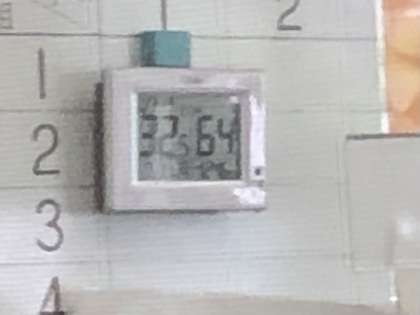 給食調理員さんは鍋や釜の確認をしています。温度計は32.64℃を指しています。調理をしている時には35℃を越える暑さとなっています。ちなみに調理室にはエアコンはありません。