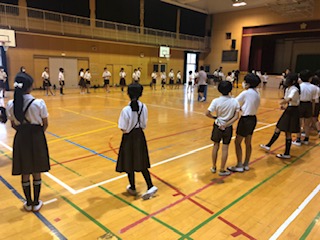 今日の5年生のプール水泳は大雨のため、中止となりました。この時間を使って体育館で林間学習のキャンプファイヤーなどの練習をしました。