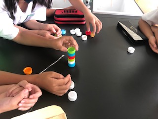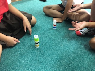 ペットボトルのふたを積んでいくのはとてもむずかしいです。6個か7個積めたらなかなかの腕前です。