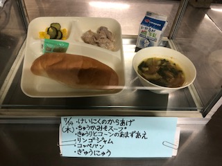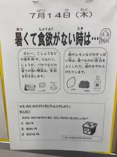 今日の給食には、香辛料を効かせた唐揚げがでました。給食カレンダーには暑い夏の食欲がない時の献立の工夫が書かれています。