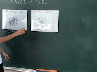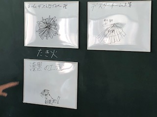 班ごとに考えた薪の組み方をボードに書いて黒板にはっていきます。