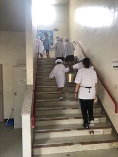給食室(児童が入れるエリア)でおかずや牛乳、食器などを受け取った給食当番は並んで教室へと向かっていきます。