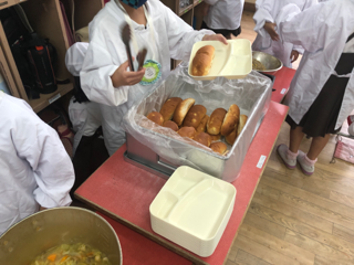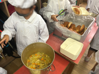 給食室から運んできたおかずやパンなどを配膳していきます。子どもたちだけでできるようになったことも増えましたね。